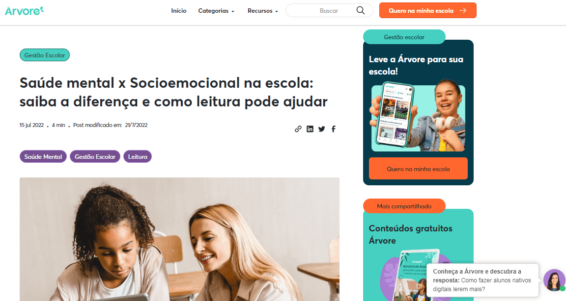 Em texto publicado em seu Blog, a Árvore mencionou o Levantamento Internacional de Boas Práticas de Saúde Mental nas Escolas, realizado pelo Vozes da Educação. No artigo, além de diferenciar saúde mental de competências socioemocionais, é enfatizado o papel da leitura como ferramenta que contribui na promoção da saúde mental a partir do desenvolvimento de competências socioemocionais.