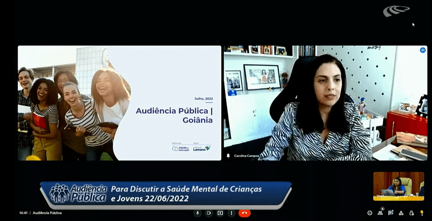 A fundadora e Diretora Executiva do Vozes da Educação, Carolina Campos, participou de audiência pública, no dia 1º de julho de 2022, no Plenário da Câmara de Municipal Goiânia, a convite da vereadora Sabrina Garcez (Republicanos). O tema debatido envolvia a responsabilidade da escola na saúde mental de crianças e adolescentes,