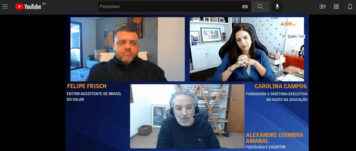 O jornal Valor Econômico promoveu uma live na tarde de 28 de junho sobre a temática “Lidando com as emoções: o que a escola tem a ver com isso?”. Com a mediação de Felipe Frisch, Carolina Campos e Alexandre Coimbra Amaral dialogaram sobre o lugar da escola durante e após a pandemia, principalmente em relação à saúde mental dos estudantes e professores.