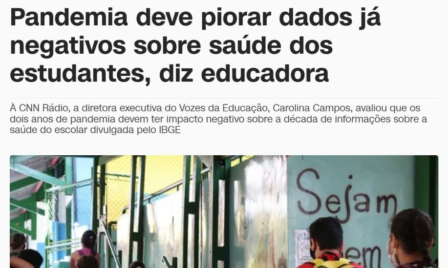 Em entrevista à CNN Rádio, Carolina Campos avaliou os dados da Pesquisa Nacional de Saúde do Escolar (PeNSE), oriundos da coleta de dados feita pelo Instituto Brasileiro de Geografia e Estatística (IBGE) durante a última década. De acordo com os indicadores comparáveis sobre a saúde dos escolares do 9º ano do ensino fundamental, os resultados são muito preocupantes e a pandemia pode ter potencializado as questões de saúde mental, porém tais informações não foram identificadas no relatório devido ao período do estudo ter sido antes da pandemia.