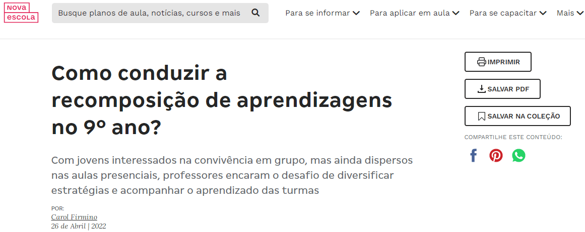 Para explorar o tema ‘recomposição das aprendizagens’, a Nova Escola entrevistou especialistas, professores, estudantes e gestores para entender como está acontecendo o planejamento docente no retorno às atividades presenciais nas escolas brasileiras. Carolina Campos, Diretora Executiva do Vozes da Educação, comentou sobre os desafios que os professores vem enfrentando ao reconhecer as lacunas nas aprendizagens em decorrência do período de aulas remotas durante a pandemia.